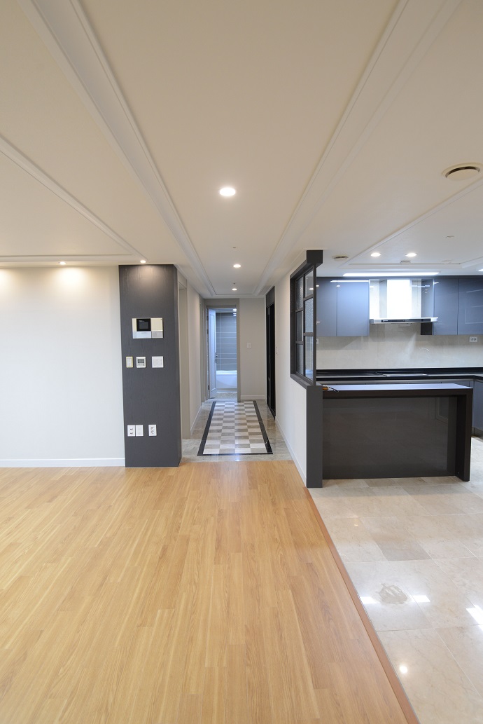 평형 : 44PY 위치 : 대구 수성구 노변동 작업내용 : 전체도배, 한샘강마루, 한샘씽크대, 욕실부분교체, 목공사, 가벽파티션작업, 목공사, 전체시트필름작업, LED조명교체, 터닝도어, 한샘붙박이장, 발코니 바이오세라믹