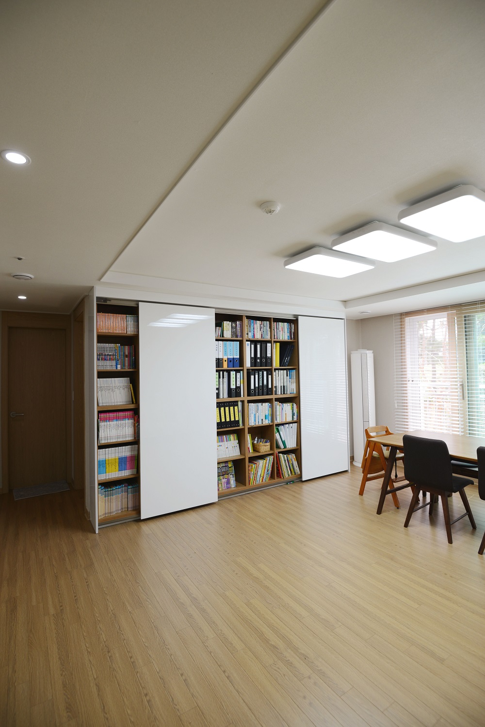 : 안방 헹거도어 제작, 북카페 인테리어 (카페형 아일랜드 제작, 거실 슬라이드책장 제작), 중문 설치